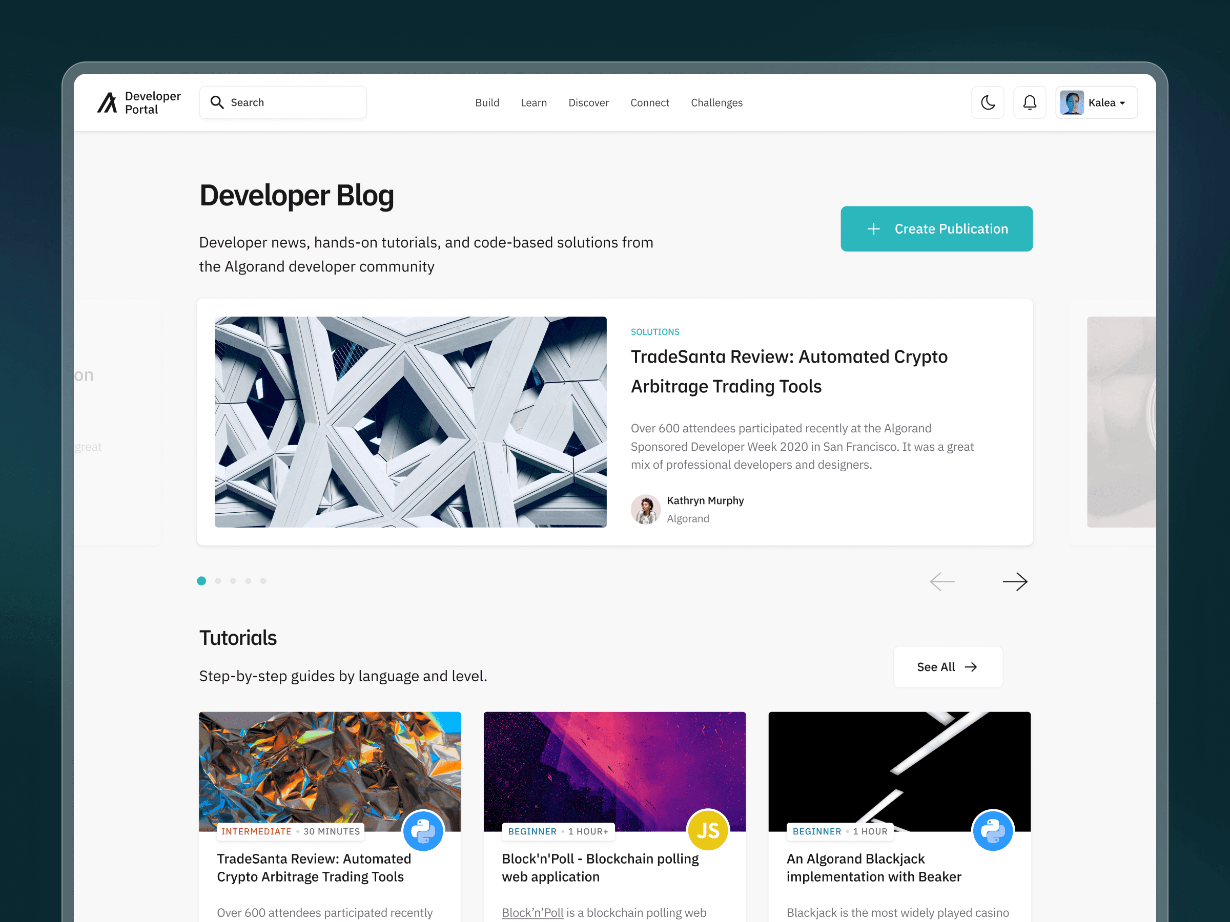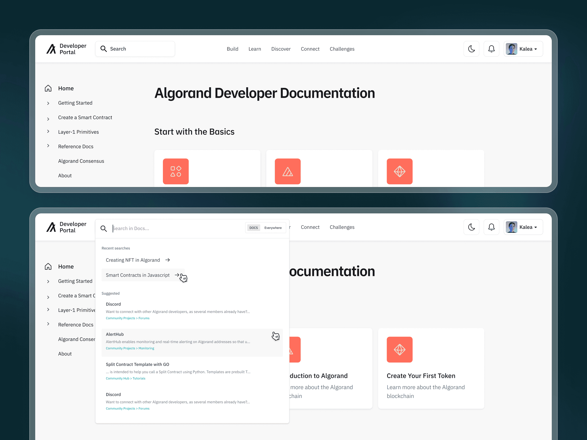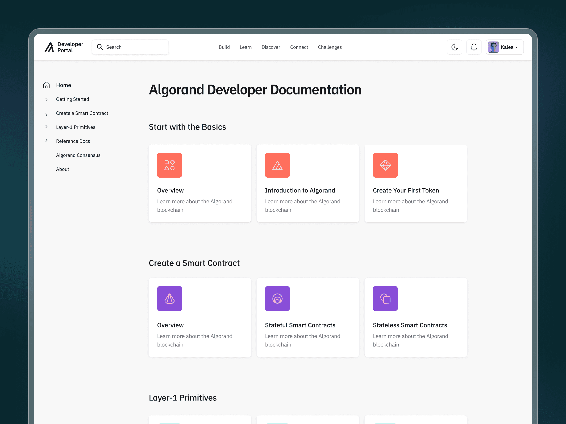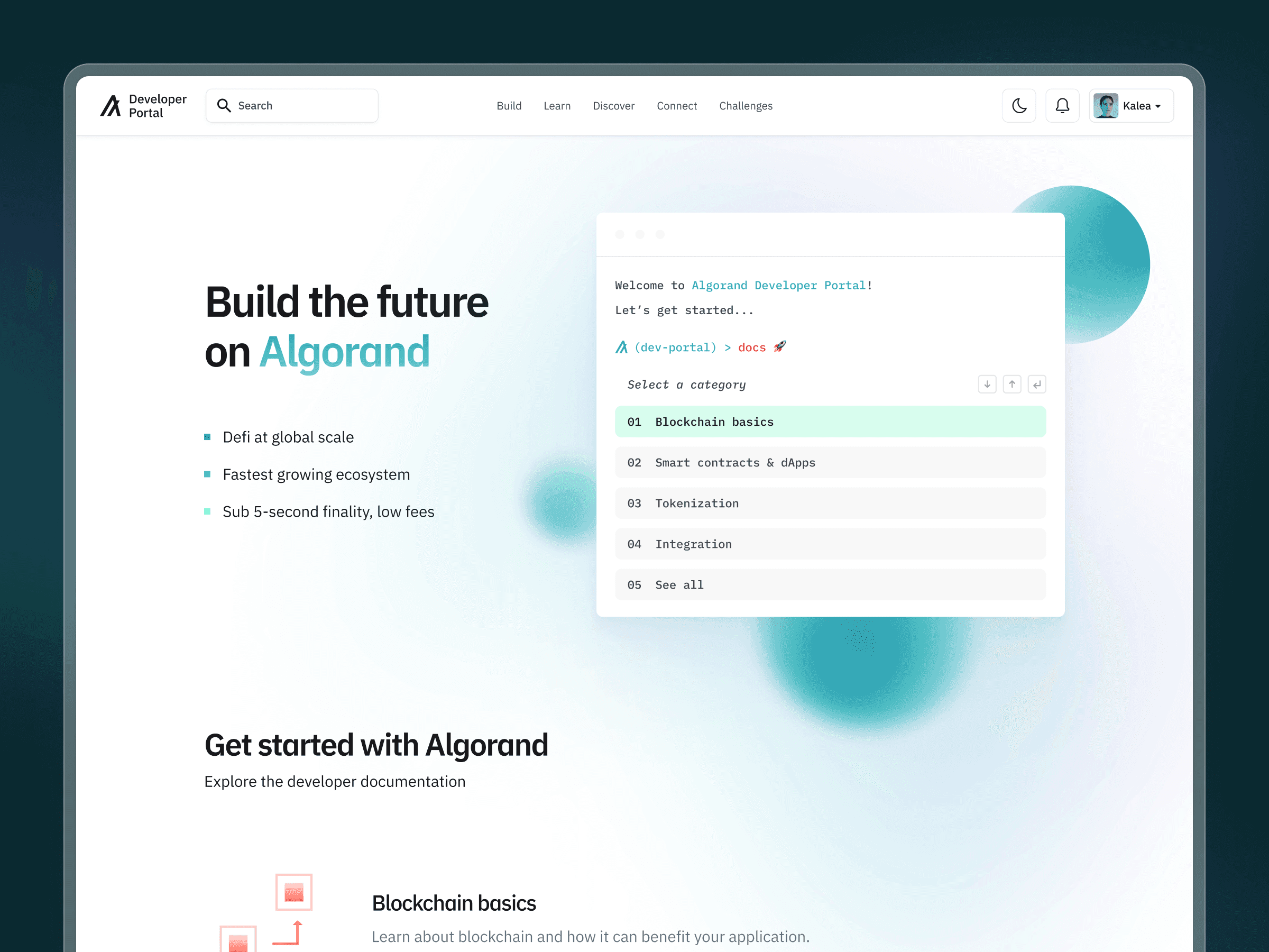 I had the exciting opportunity to lead the design efforts for the Algorand Developer Portal, the official hub for developers within the Algorand ecosystem. The platform houses the official docs, a variety of blog posts/tutorials, events calendar, real-time blockchain metrics dashboard, and more; aimed at empowering developers to leverage the capabilities of Algorand's blockchain technology.