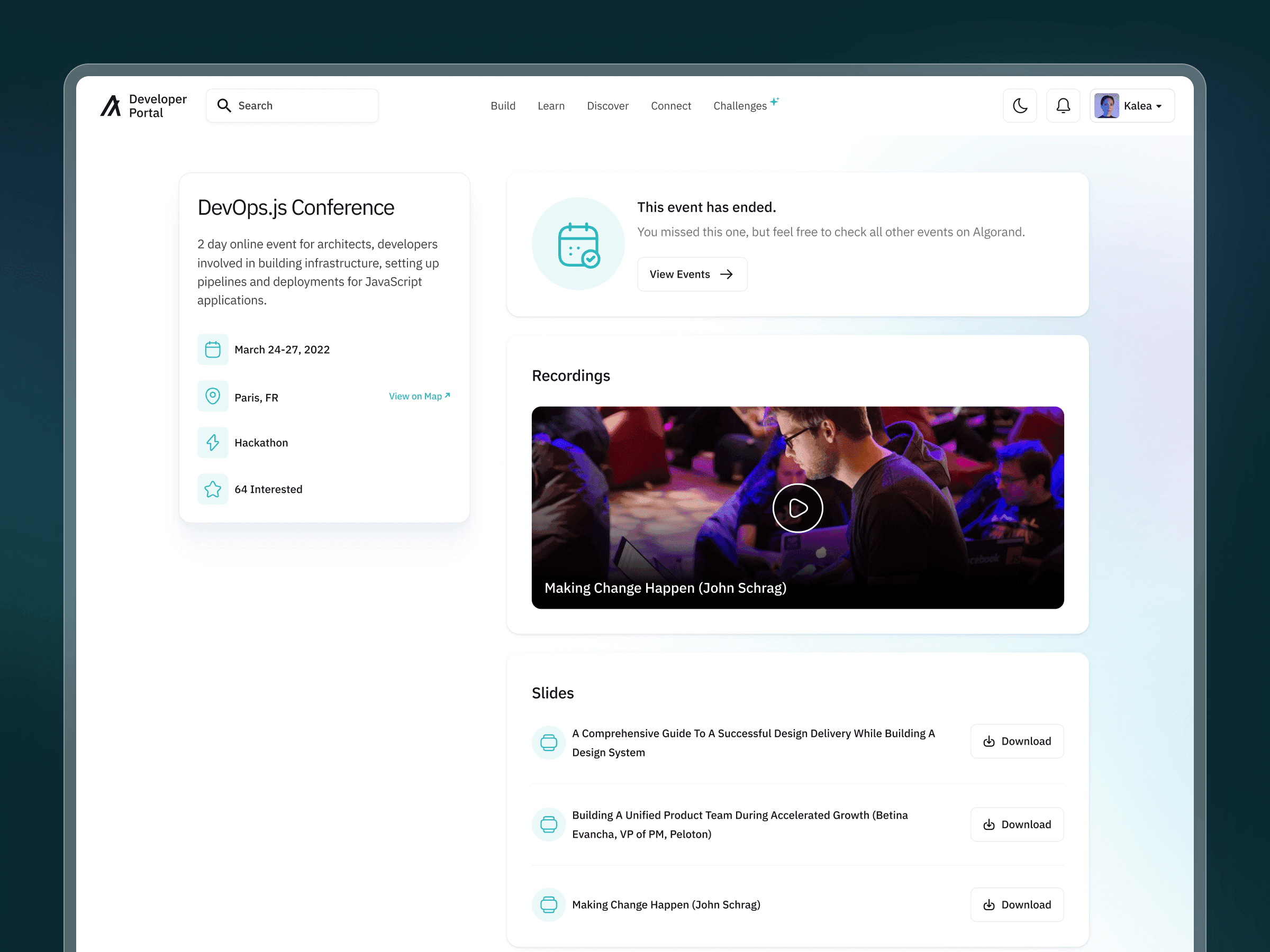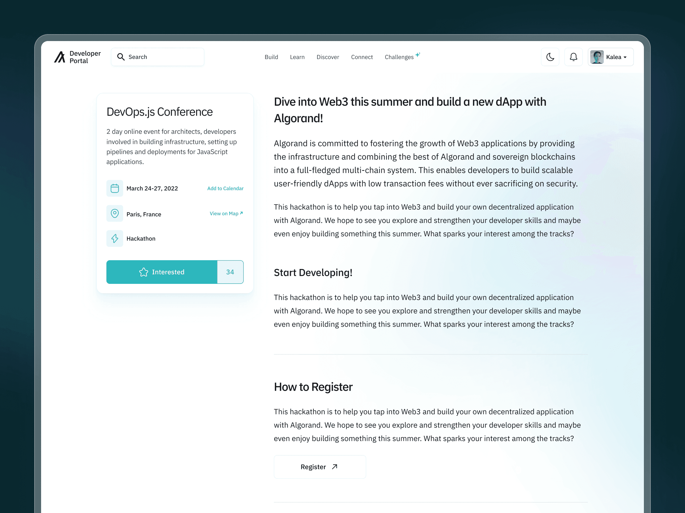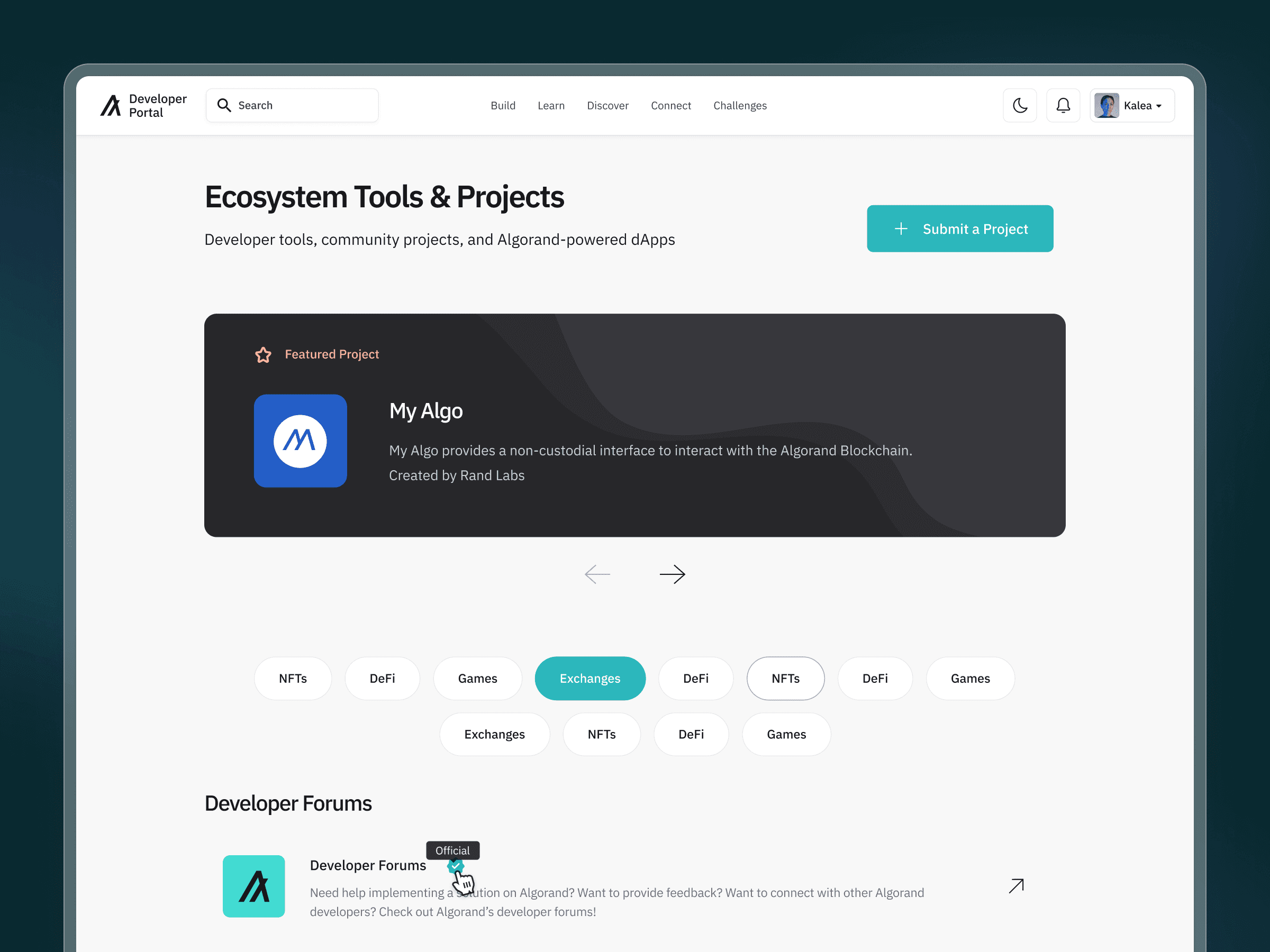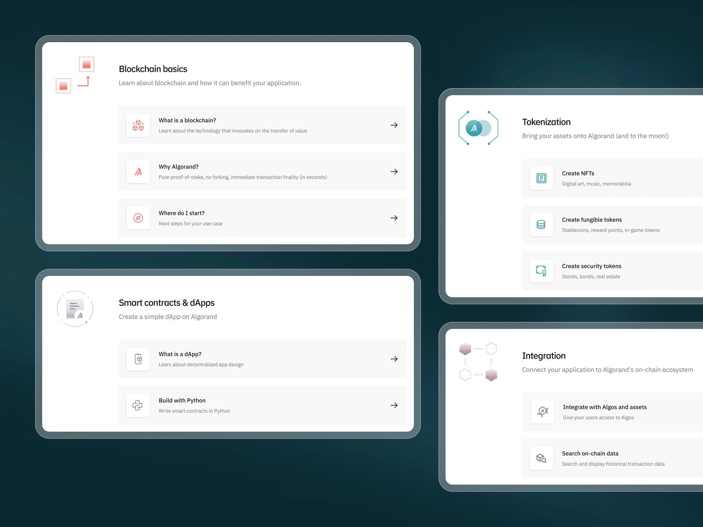I had the exciting opportunity to lead the design efforts for the Algorand Developer Portal, the official hub for developers within the Algorand ecosystem. The platform houses the official docs, a variety of blog posts/tutorials, events calendar, real-time blockchain metrics dashboard, and more; aimed at empowering developers to leverage the capabilities of Algorand's blockchain technology.