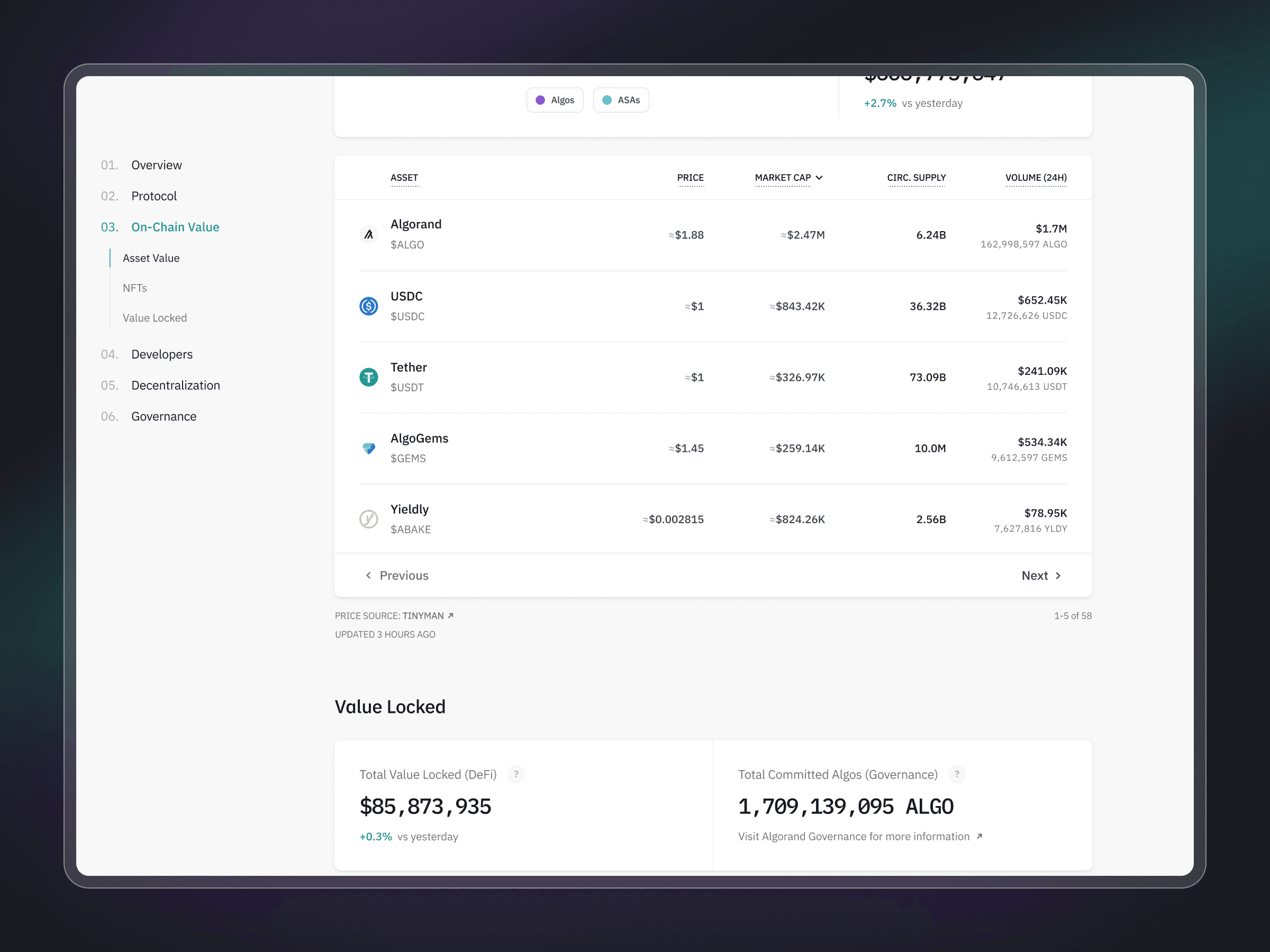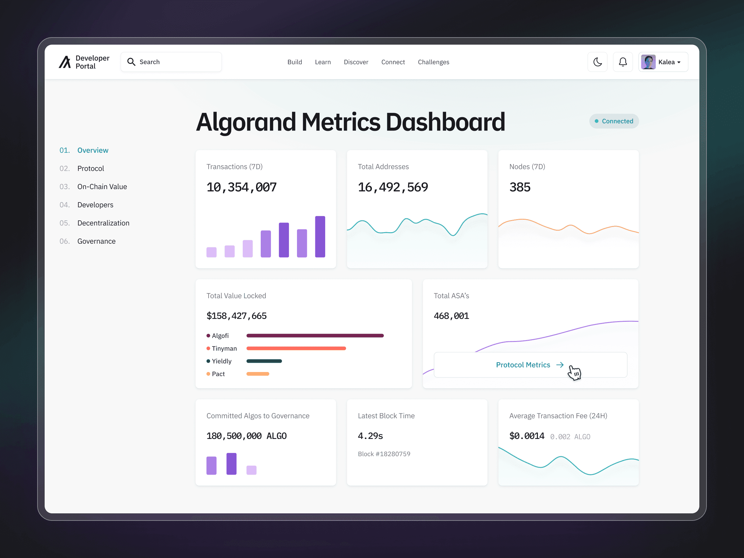 In my role as a designer, I played a pivotal role in shaping the Algorand Metrics Dashboard—an instrumental tool that provides a comprehensive visual representation of the Algorand blockchain's performance metrics. This dashboard empowers users to comprehend vital blockchain statistics such as transactions per second, daily transaction totals, account numbers, developer counts, and total value locked.