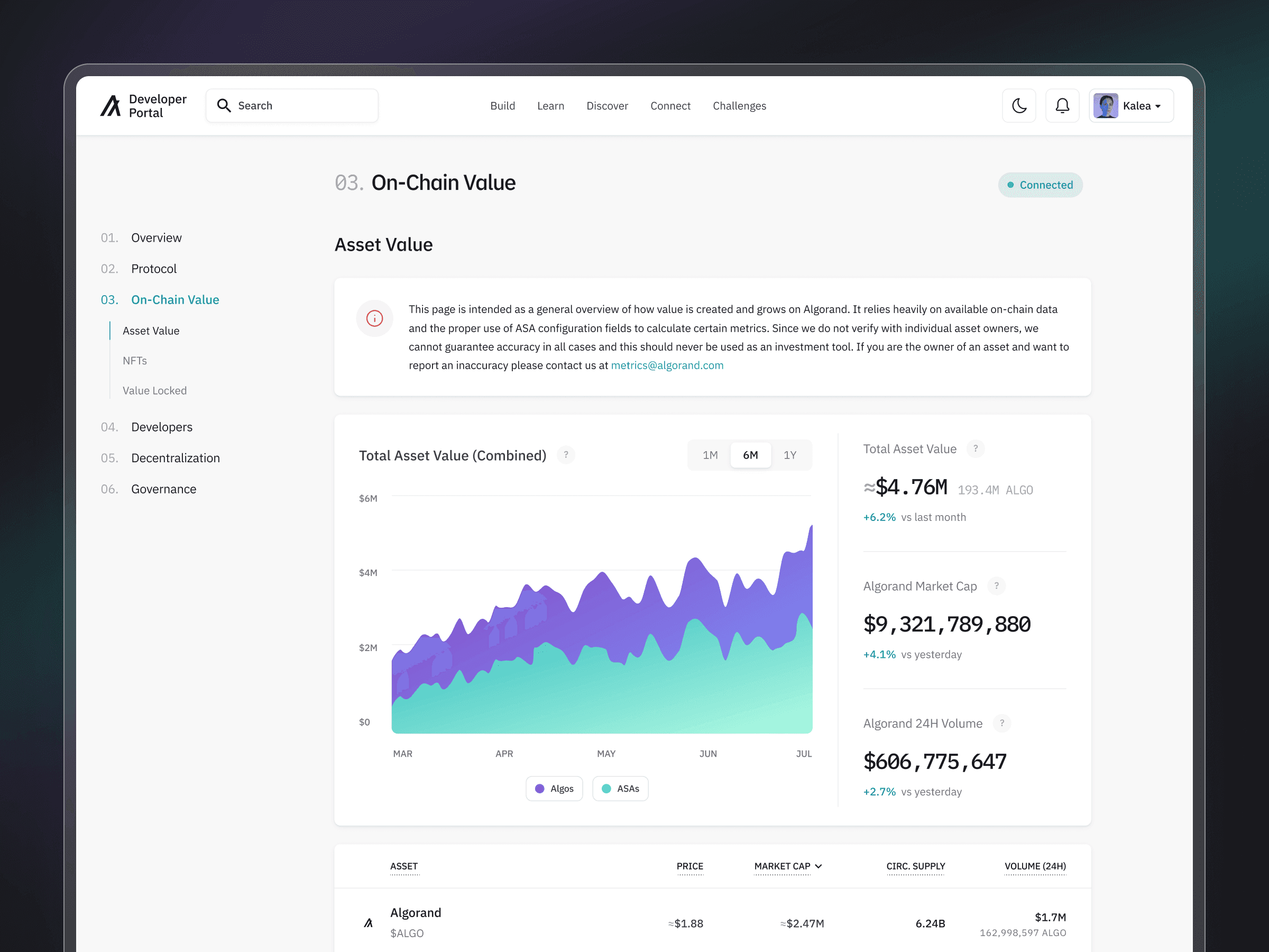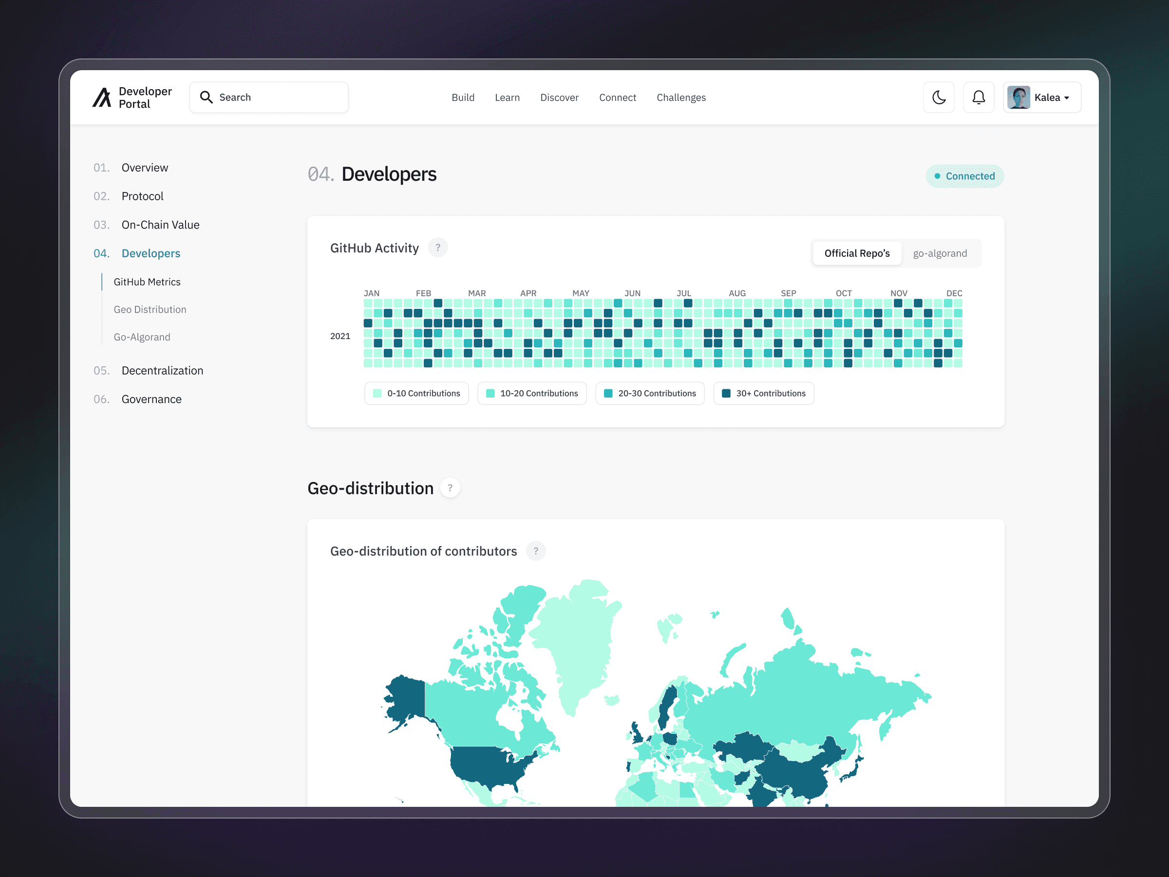 The dashboard features an array of historical data visualizations, including bar charts, line graphs, and tables. These graphics are accompanied by user-friendly time and category filtering options that enhance data exploration. Just as with the Algorand Developer Portal, I orchestrated the end-to-end design of the Algorand Metrics Dashboard, ensuring a seamless user experience and a visually cohesive interface.