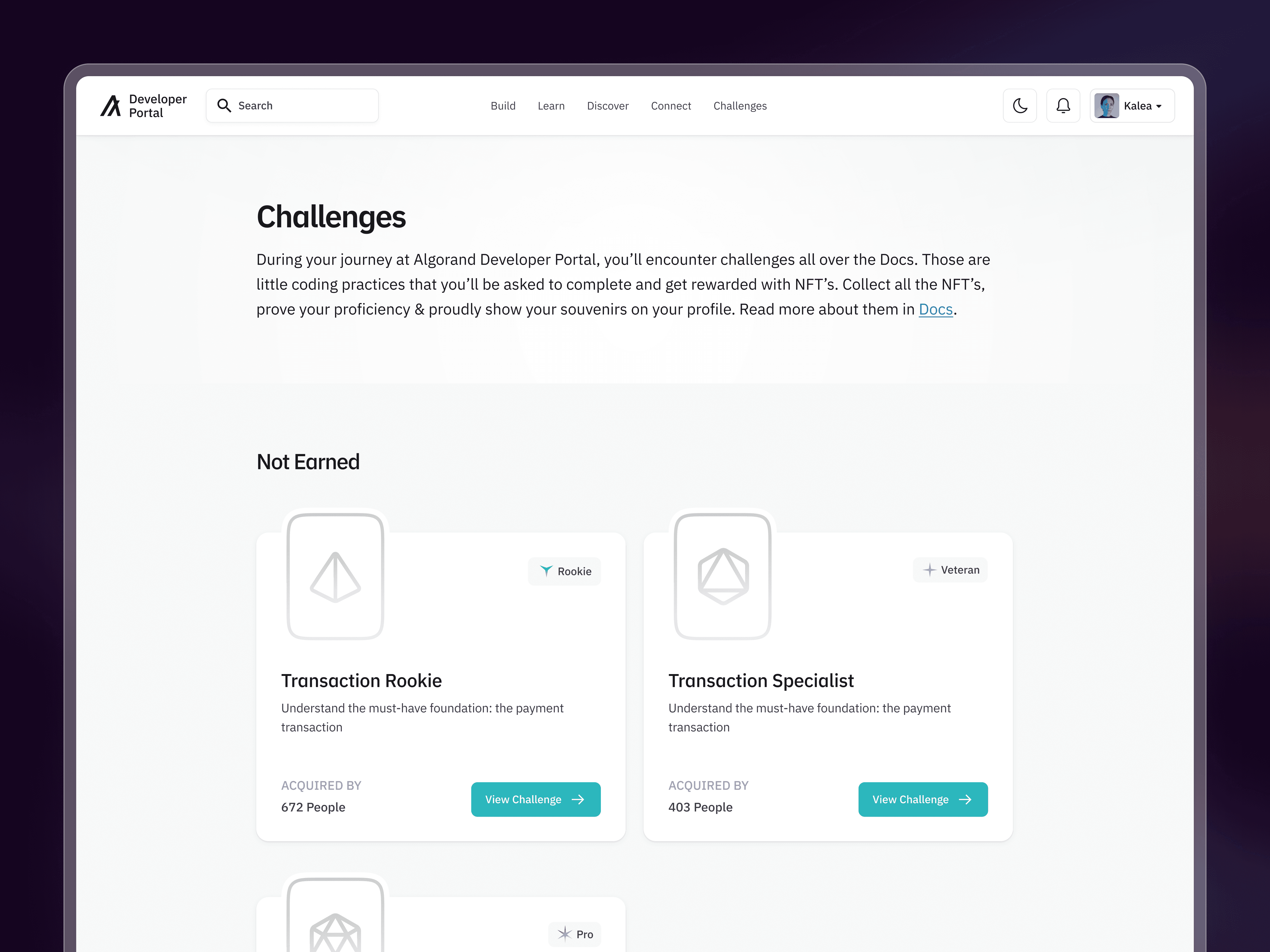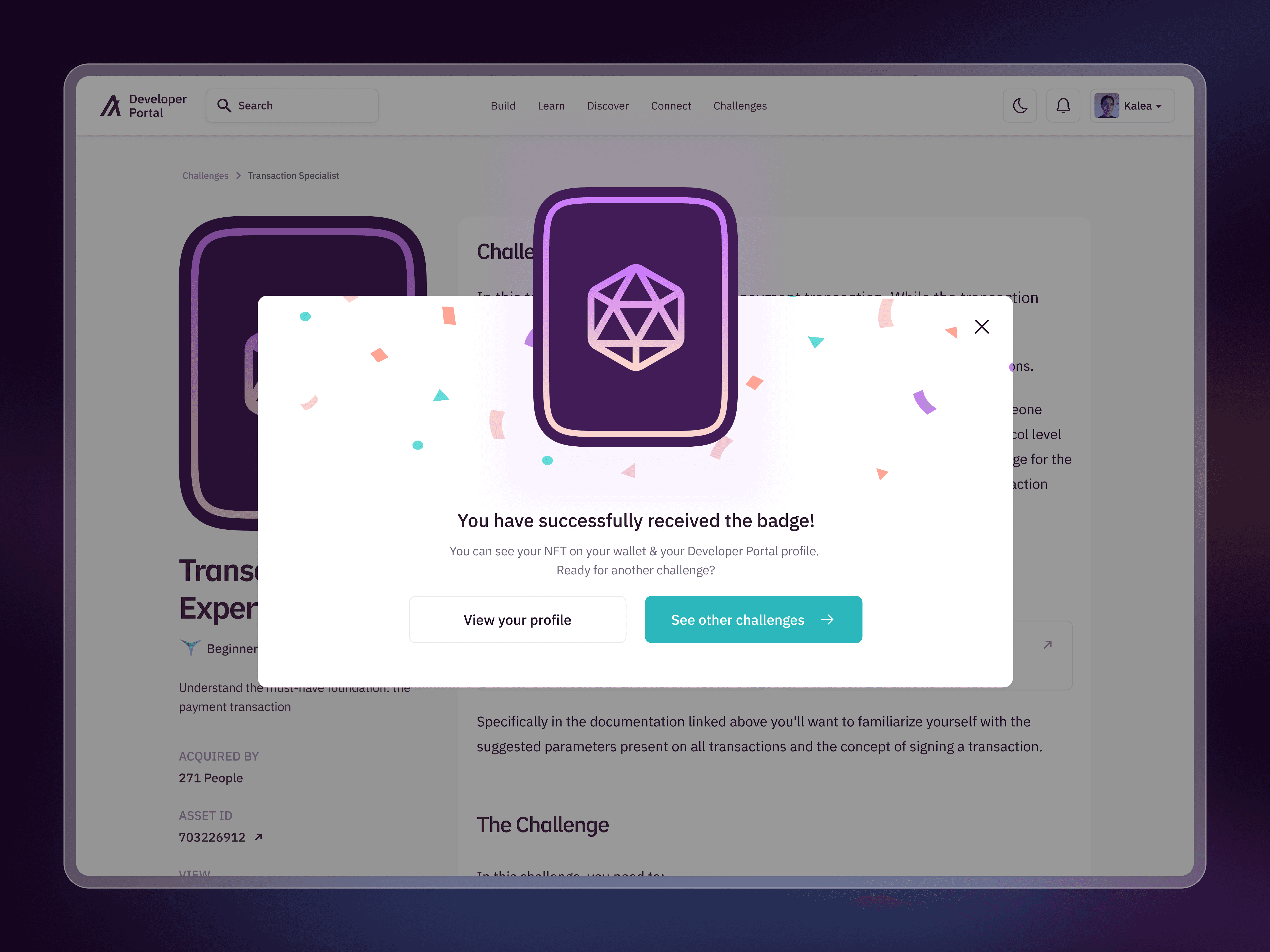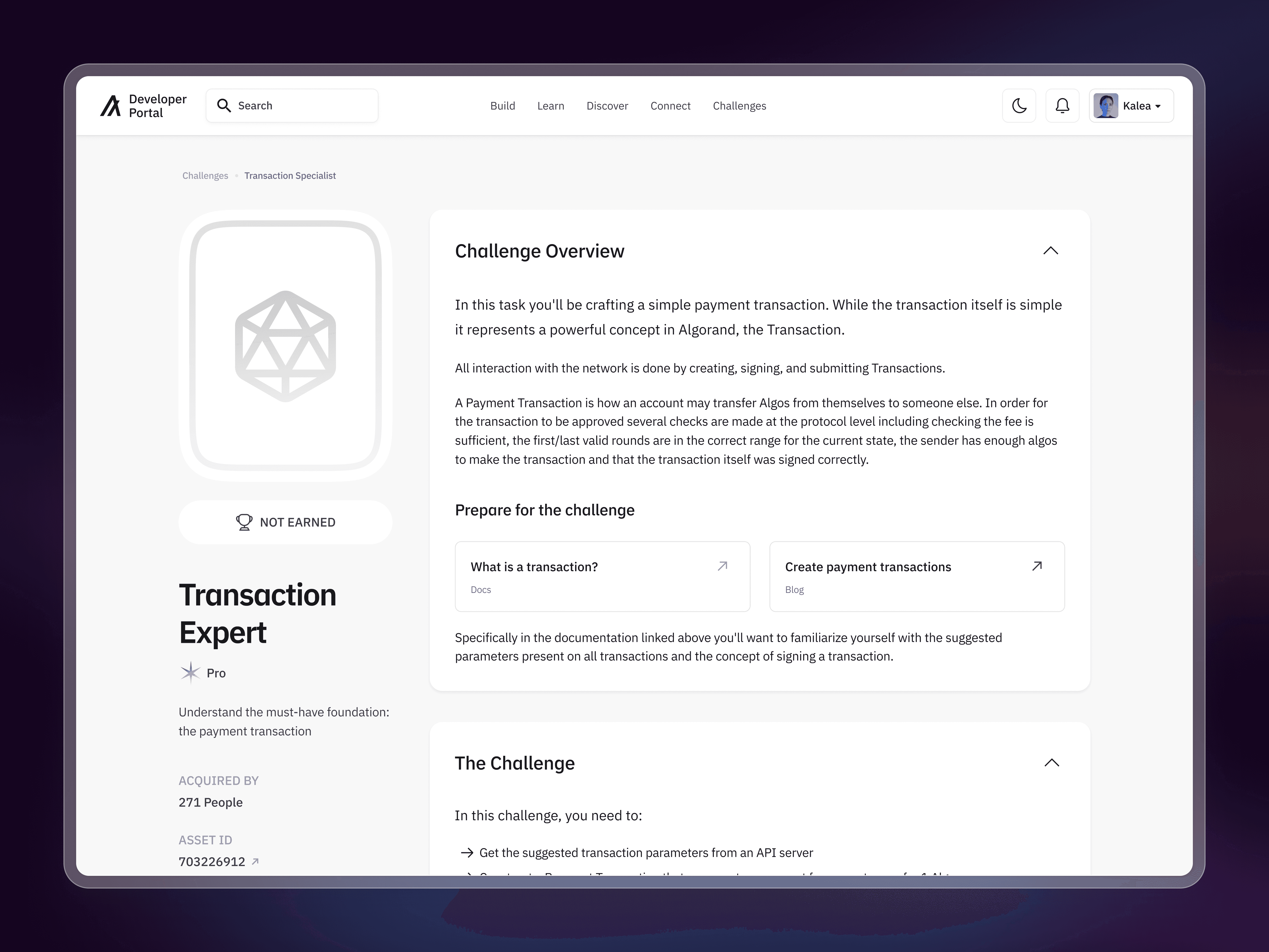 In the Challenges section of the Algorand Developer Portal, we bring coding challenges to life, with options for different levels of difficulty. Here, users encounter real-world blockchain problems along with the relevant resources needed to solve them. It's not just about coding; it's about testing your problem-solving skills. Successfully solve a challenge, and you'll earn NFTs that showcase your accomplishments on-chain. We've added a touch of gamification to the process, making learning and coding engaging, rewarding, and dynamic.