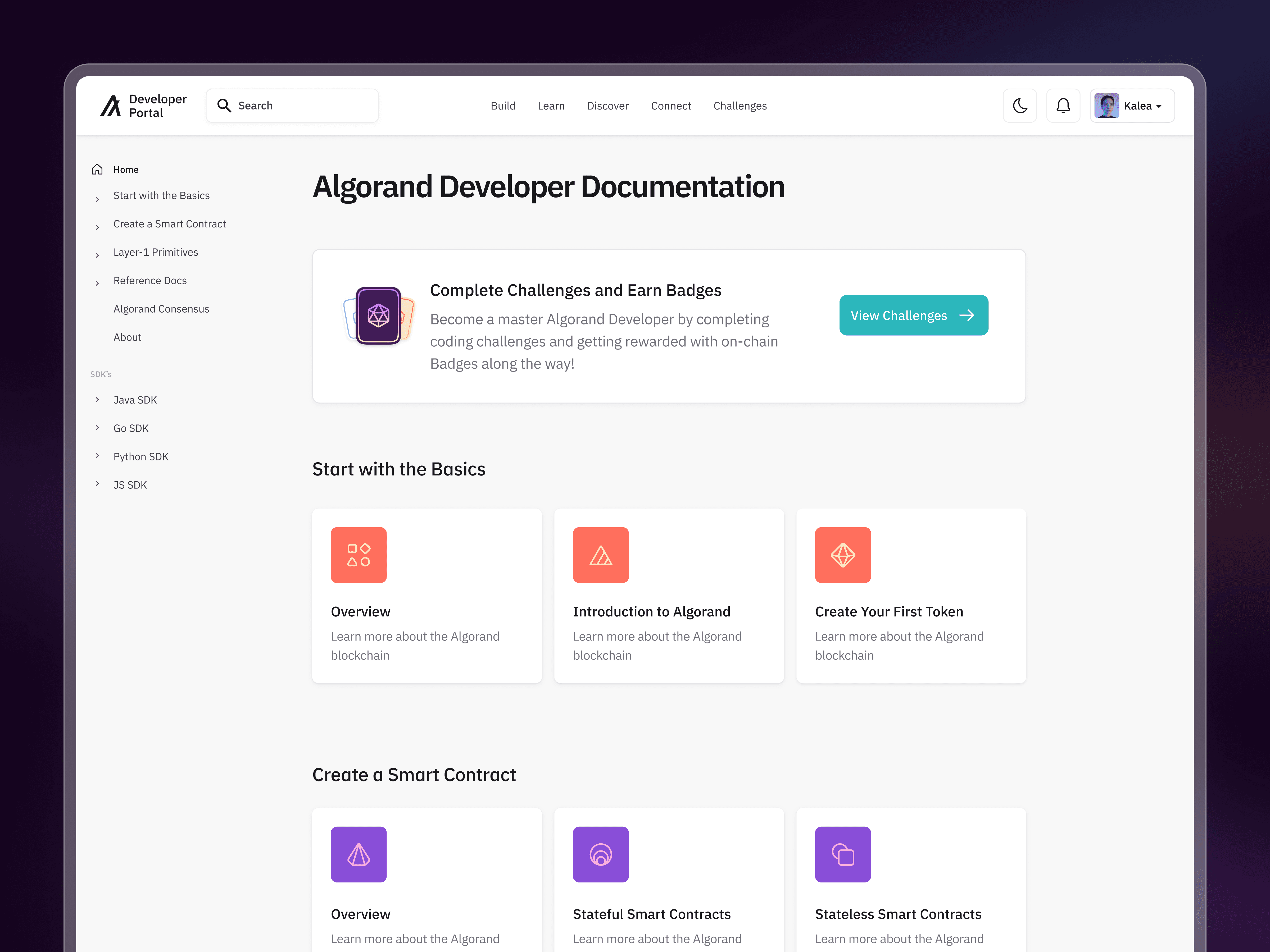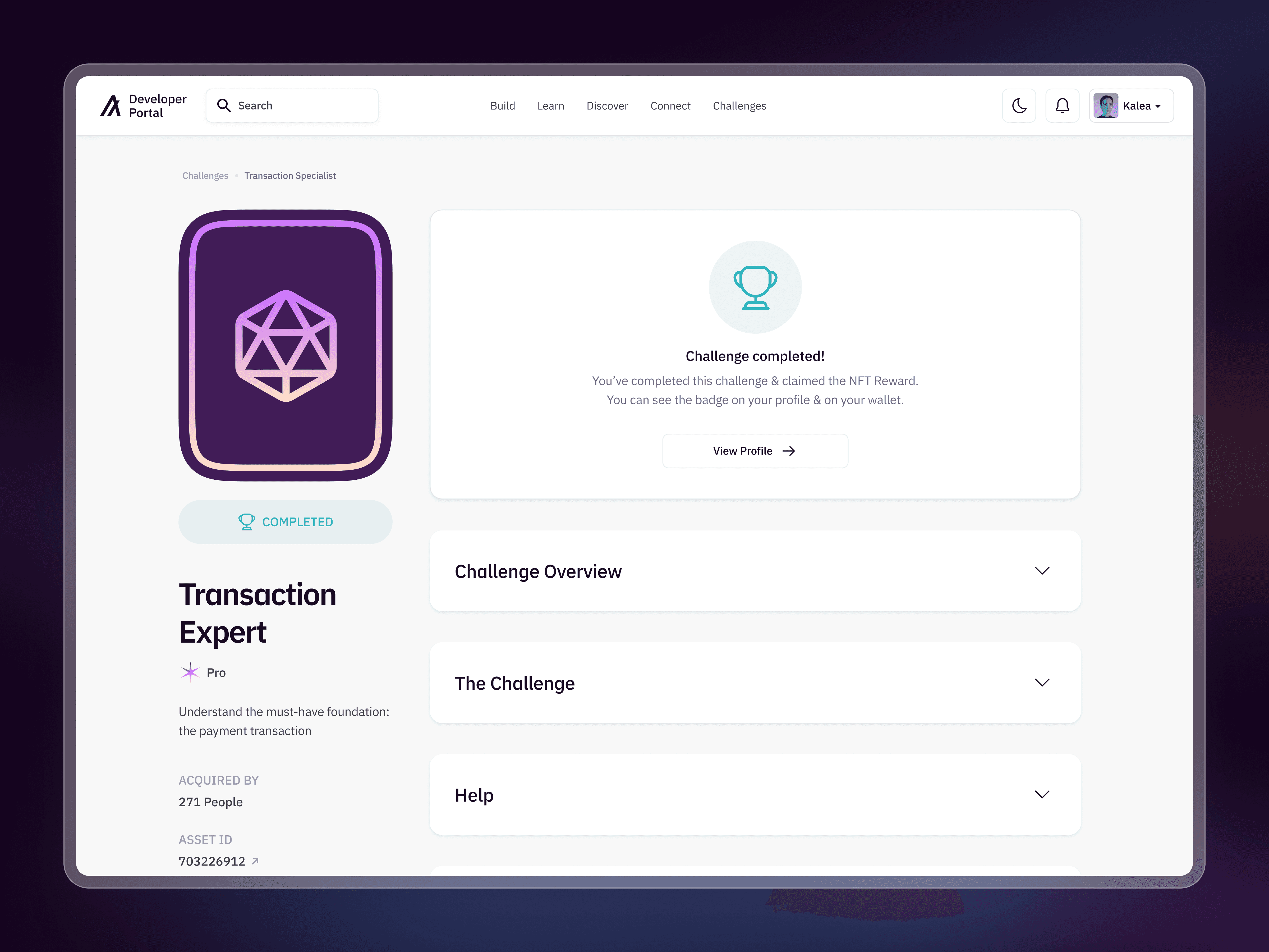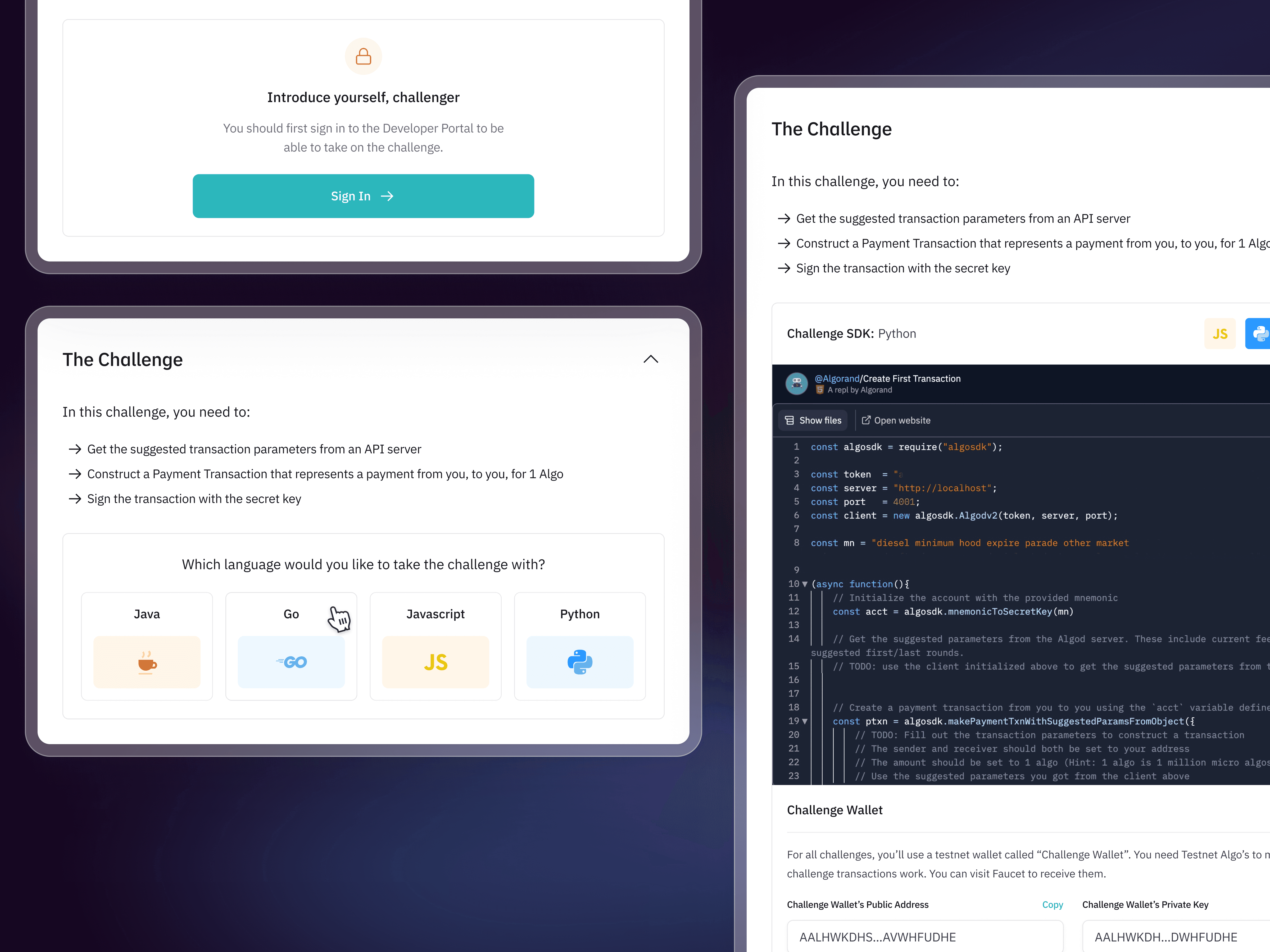 In the Challenges section of the Algorand Developer Portal, we bring coding challenges to life, with options for different levels of difficulty. Here, users encounter real-world blockchain problems along with the relevant resources needed to solve them. It's not just about coding; it's about testing your problem-solving skills. Successfully solve a challenge, and you'll earn NFTs that showcase your accomplishments on-chain. We've added a touch of gamification to the process, making learning and coding engaging, rewarding, and dynamic.