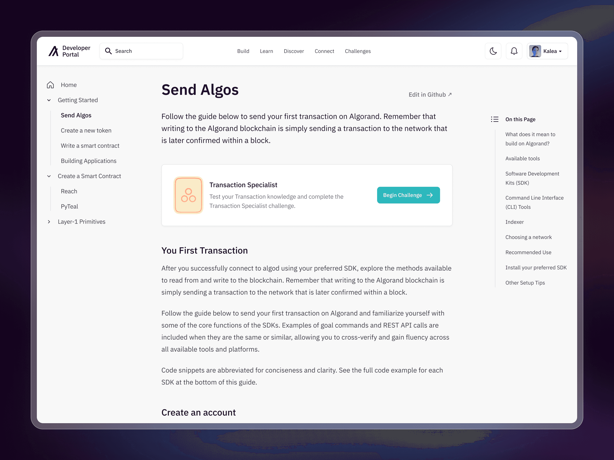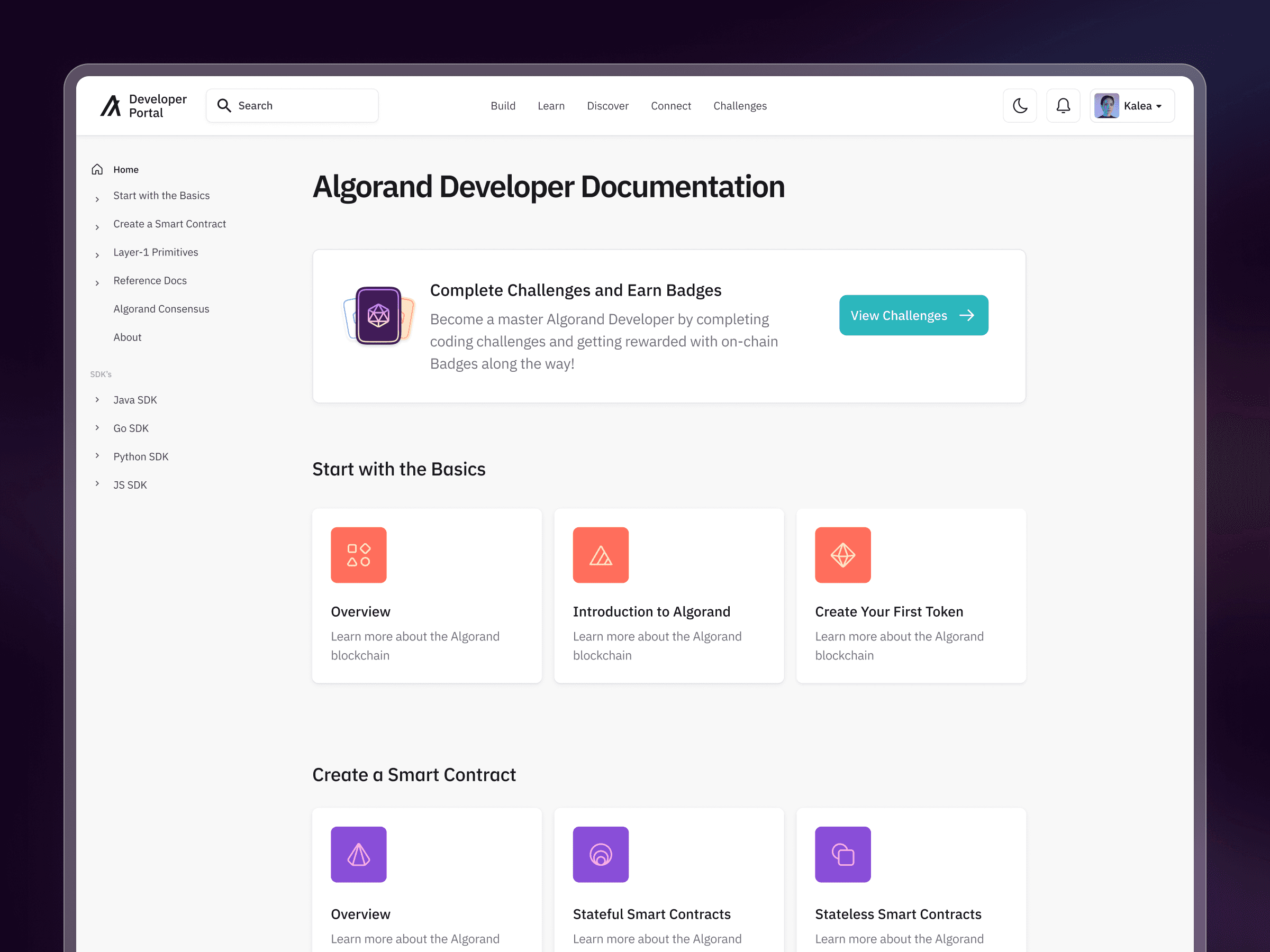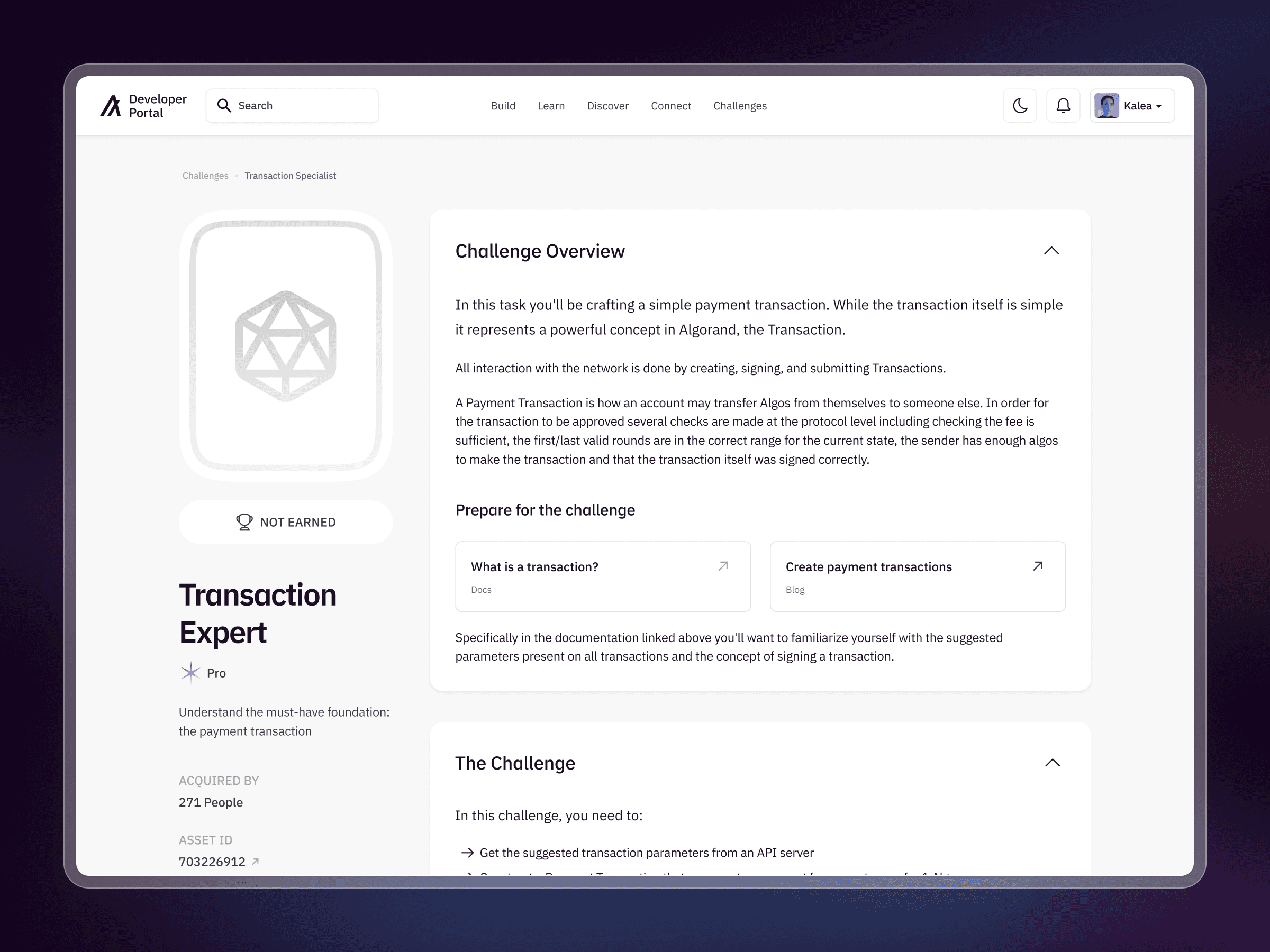 The Challenges section of the Algorand Developer Portal helps developers learn by solving real-world blockchain problems across different difficulty levels. Each challenge combines a concrete task with the documentation and tools needed to complete it, turning learning into hands-on practice rather than passive reading.